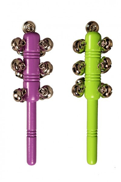 Данная модель сделана из дерева, цвета в ассортименте. На корпусе с удобной ручкой закреплены 13 бубенчиков. Размер инструмента 22 см.